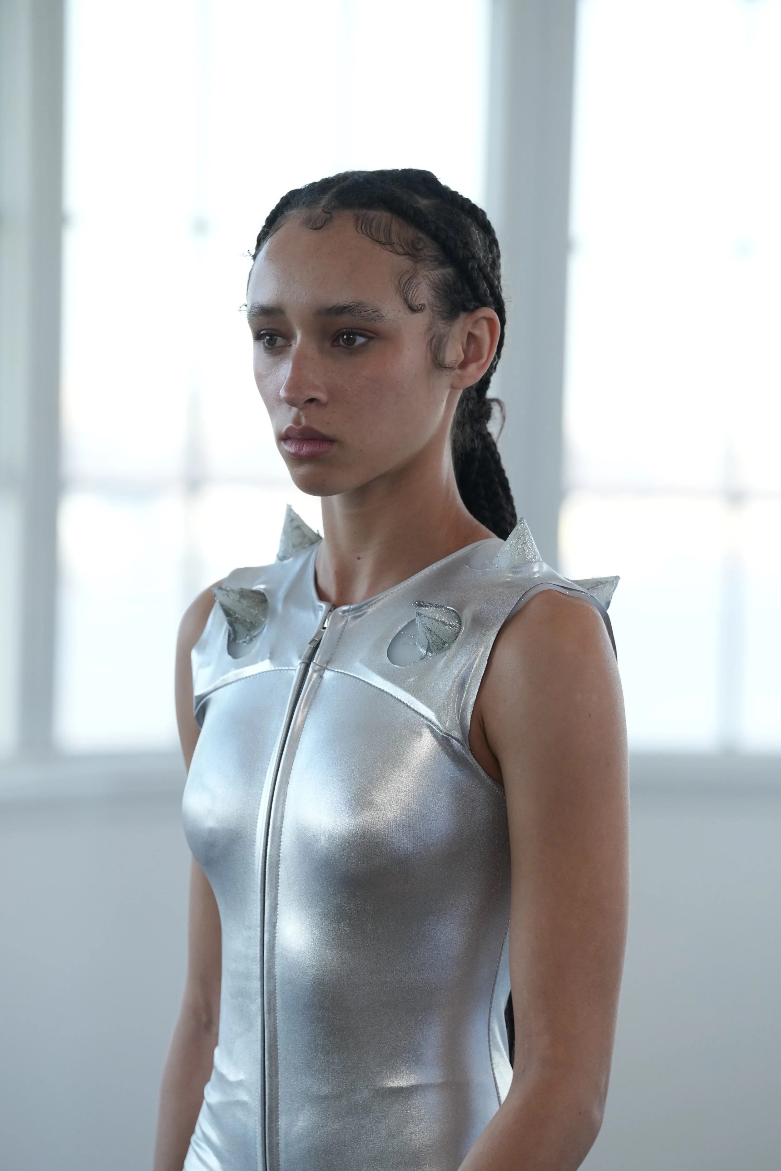 Silver bodysuit with silicone shoulder inserts, Model: Olanna Sams