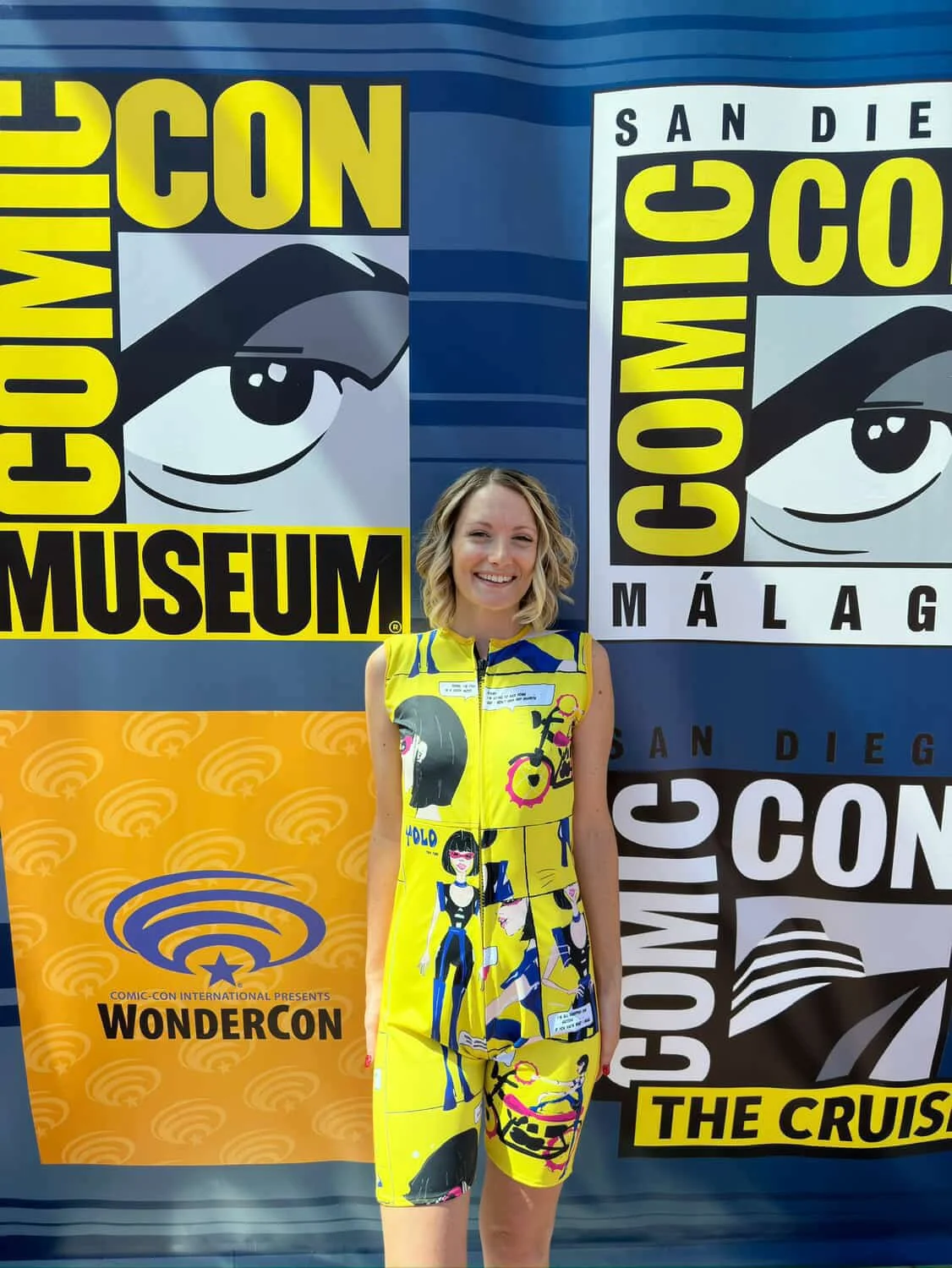 Haylee Cook wearing the S/S 2024 ‘YOLO . . . this time’ yellow jumpsuit at the Comic-Con in San Diego in July, 2024.