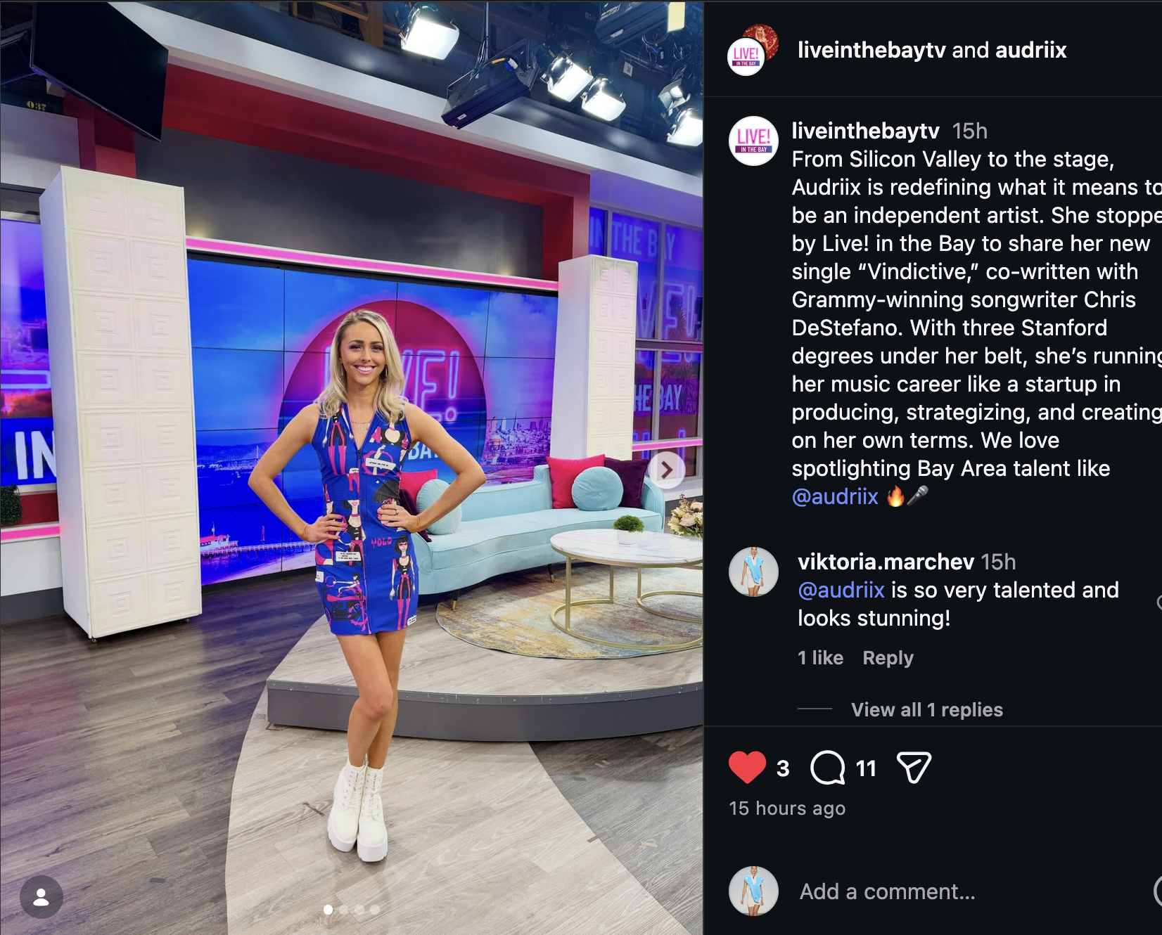 Audriix, singer wearing the S/S2024 ‘YOLO . . . this time’ dress during her interview at Live In The Bay on January 22nd, 2026